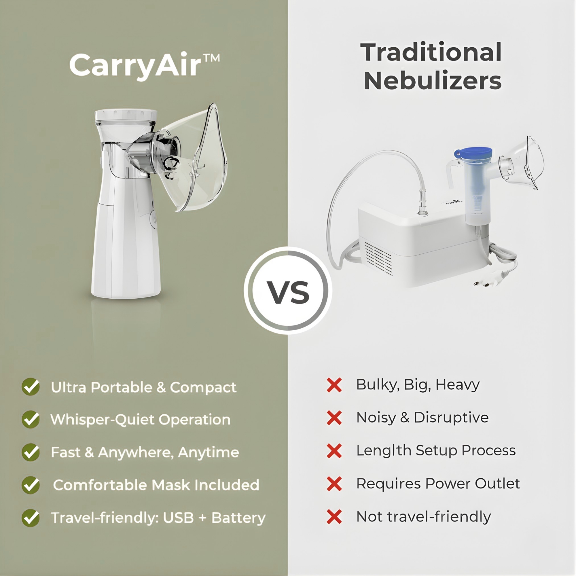CarryAir delivers quiet, fast mist therapy with dual power and travel-friendly size. Others are bulkier, louder, or need constant power, making treatments inconvenient.